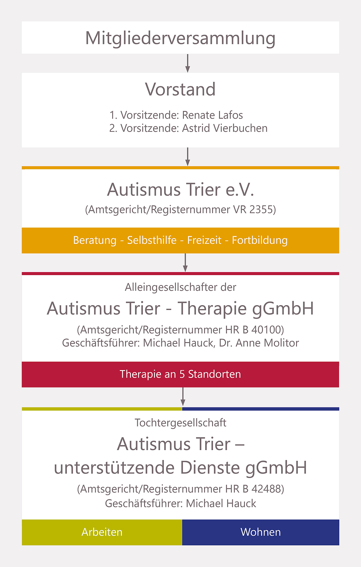 Autismus Trier - das sind neben dem Eltern- und Selbsthilfeverein Autismus Trier e.V. auch die rechtlich selbstständige Autismus Trier - Therapie gGmbH und die Autismus Trier - unterstützende Dienste gGmbH. Der Verein ist einziger Gesellschafter der Therapie gGmbH, die wiederum einziger Gesellschafter der unterstützenden Dienste gGmbH ist.